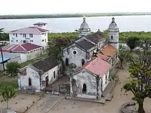 The cathedral is built in Portuguese colonial style, and its design was reportedly based on the Sé Cathedral in Goa, India.[4] It has been described as in the Mannerist and Indo-Portuguese traditions.[2] A "magnificent" yet "austere" building,[4] it has been compared to the 17th-century Church of Our Lady of Nazareth in Luanda, and the 18th-century Church of Our Lady of Pópulo in Benguela, both in Angola.[2] The cathedral faces the Quelimane River. A stout building, its facade consists of a pediment flanked by two domed bell towers.[2] The building's sides include covered galleries, which are commonly featured in Indian churches.[2]