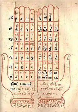 The so-called "fortune-telling books" (also "divinatory books") can probably also be attributed to cosmological works, which are currently not officially assigned to any of the genres of Kievan Rus'.[20] Fortune-telling books (Volkhovnik, Gromnik, Kolyadnik, Trepetnik, Enchanter, etc.) were mainly distributed secretly: they were copied, sewn into other books, and passed on by inheritance. Officially, the distribution of such literature was persecuted by the church; lists of forbidden (so-called renounced) books of Kievan Rus' were compiled, in which divinatory literature was equated with apocrypha.[21]
