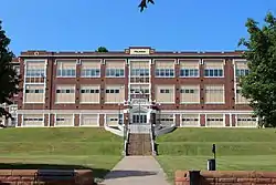 The projecting central block is nine bays wide, containing the four-door main entrance in the center bay in a projecting vestibule. The entrance is flanked with brick buttresses and topped by a parapet containing a plaque reading "A.D. 1923." The entrance opening is a compound Tudor arch with a transom above containing pointed arch tracery. Above the main entrance is a four-part horizontal compound window on the first floor, an eight-part compound window on the second, and a sixteen-part compound window on the third.[2]