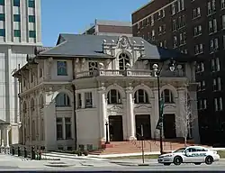 When the building was constructed, it was described as a "combination of the Doric and Ionian styles of architecture", and would later be classified in the Beaux Arts style.[2] It was designed by Heins & LaFarge of New York City, and the local supervising architect was Frederick A. Hale. The library was three stories tall with a two-story entrance pavilion constructed of oolite limestone and 20,000 square feet (1,900 m2) of floor space. The roof was slightly flared, and the roofline was broken by a large carved stone gable with a center arched window and four decorated pilasters. The entrance pavilion's sides were curved around the spiral staircases at both ends of the entrance foyer. The pavilion was divided into three sections by four columns; each bay contained oak double doors leading to the foyer. After going through the foyer, the main reading room is revealed. In the center of the room stood a librarian's desk made of steel and topped by golden oak, the same finish of the interior of the entrance foyer. On the upper floor, the main auditorium contained seating for 350 people.[2]