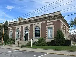 The former Post Office stands at the corner of Washington and Federal Streets, at the edge of Biddeford's Main Street business district. It is a single story masonry structure, built with a steel and concrete frame which is clad in red brick and granite trim. Its main facade is five bays wide, each bay articulated by granite quoining. The outer two bays house rectangular windows and are topped by stone panels, while the middle three have round-arch openings. The entrance is in the center bay, and has double doors flanked by pilasters and topped by an entablature that separates it from the half-round transom window. The flat roof has a modillioned cornice and is surrounded by a balustrade. The side facade, facing Federal Street, has a simpler secondary entrance and window bays similar to the outer ones on the main facade.[2]