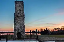 The chimney has been repurposed several times since by British and American interests. Relocated three times (1902, 1942, and 2015), the Old Stone Chimney is currently located between the Niagara River and the Robert Moses Parkway east of the Adams Slip along the bike path on the river. Previously located in the former Porter Park on Buffalo Avenue, at the foot of 10th Street along an embankment of the Niagara Scednic Parkway, close to the exit ramp to John B. Daly Boulevard.[2] The Old Stone Chimney is 31 feet tall and weighs approximately 60 tons.[2]