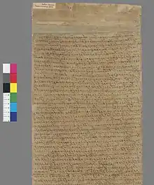 The Old Tibetan Chronicle is extant in two manuscripts in the Pelliot Collection at the Bibliothèque nationale de France in Paris, and some manuscript fragments. The main scroll comprises Pelliot tibétain 1286 and Pelliot tibétain 1287. The Tibetan text is written on the blank verso sides of panels pasted together from Chinese scrolls. In the first critical edition of Pelliot tibétain 1286 and Pelliot tibétain 1287, Jacques Bacot and Charles Toussaint considered them to be represent separate texts and referred to Pelliot tibétain 1286 as "Principautés anciennes et généalogie des rois," but following the suggestion of Geza Uray, both are now considered to be two parts a single original manuscript and can be referred to together as the Old Tibetan Chronicle.[3] In addition, two folios from a single original manuscript, Pelliot tibétain 1144 and IOL Tib J 1375, overlap with narratives found in the Chronicle, though differing in certain details.