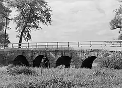 The Old Town Bridge is a historic stone arch bridge in Wayland, Massachusetts. It is located just north of Old Sudbury Road, and is sited across what was formerly a channel of the Sudbury River, which now flows just west and north of the bridge. The four-arch bridge was built in 1848 by Josiah Russell on a site where it is supposed that the first bridge in Middlesex County was built in the 1640s. It was for many years on the major east–west route connecting Boston to points west and south. Originally built of dry-laid stone, the bridge was rebuilt with mortar after being damaged by flooding in 1900. It is 60 feet (18 m) long and has a roadbed 20 feet (6.1 m) wide, with each arch spanning about 10 feet (3.0 m). The bridge was open to vehicular traffic until 1955.[2]
