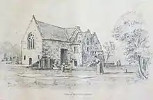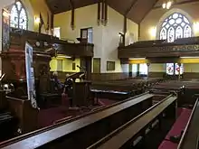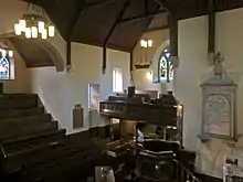 Proposals to restore the old kirk were at first "laughed at as a Utopian idea", but subscriptions were raised and extensive restoration work was carried out in 1864 under the supervision of the architect James Salmon. The interior was gutted, and the old earthen floor dug out to lay an asphalt damp-proof layer: over 70 copper coins and two silver coins were found, the earliest from 1634; a silver shilling was dated 1824.[31] The exterior walls were rebuilt in places and faced ashlar, and a church tower designed by Salmon was built at this time, incorporated stairs serving the Cartsburn Loft and the Farmer's Loft in place of the old external stairs. The walls were lined with lath and plaster painted a warm cream colour, and dark stained timber linings to the roof formed the ceiling. The church re-opened on Christmas Day, 1864.[32]
