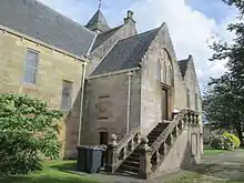 About 1696 the west (Carts-burn) aisle and north gable were extended by 15 feet (4.6 m), and the south gable by 10 feet (3.0 m), so the cruciform church was now overall about 74 feet (23 m) from north to south, and 63 feet (19 m) over the transepts. A new two storey extension was built at north side of the Schaw aisle, with Sir John Schaw's retiring room on the first floor. The ground floor, with open arches supported on a pillar, was used as a mortuary.[17]