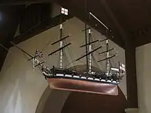 Scale model of a 20-gun frigate suspended above the Sailor's loft.