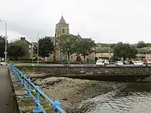 From 1711, John Scott began shipbuilding on the opposite bank of the Westburn, and from 1740 onwards shipyards increasingly encroached on the land between the Kirkyard and the Clyde. Caird & Company took over two shipyard berths close to the church in 1871, and photographs show ships under construction looming high above the kirk.[38] In 1917 Caird & Co. were taken over by Harland and Wolff, which proposed huge expansion of the shipyard, taking over several properties including the original harbour, the kirk and the kirkyard. They offered generous compensation, including a new site about 0.5 miles (0.80 km) further west along the coast at the east end of Greenock's Esplanade, and agreed to have the kirk carefully taken down and re-erected.[39][40] This was done under the supervision of the architect James Miller. A new tower was built to Miller's design,[3] and the church was reoriented, so that the Cartsburn Aisle and the main entrance, which had originally faced west, now faced north-east.