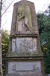 The kirkyard had been in use as a cemetery from 1592 until it closed in 1857.[3] Remains of the burials were re-interred in a mass grave in Greenock's central Cemetery, save for the grave of Mary Campbell (Highland Mary). The 1842 monument to her, designed by John Mossman, was moved from the old Kirkyard to Greenock Cemetery, and Mary's remains were re-interred under it on 13 November 1920 in a solemn ceremony.[26]