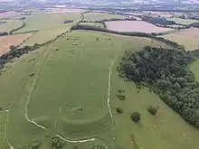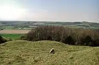 On the summit of the hill is an Iron Age hill fort. Within the hill fort can also be found Bronze Age barrows dating between 2100 to 750 BCE. The fort itself was probably built in the Early or early-Middle Iron Age (600-300 BCE) and fell out of use around the beginning of the Late Iron Age (150-100 BCE), as this is the general pattern for hill forts in the south-east of England. More modern archaeology dates from World War II when the British Army used the hill as a mortar testing range. Some unexploded Ordnance may still remain in 'fenced-off' sections of the hill however grazing hill-sheep access all areas so danger to the casual walker is likely to be low.[6]