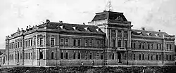 The entire interior of the first floor has been designed in a dignified and representative way. On this way was solved the entire entrance hall, stairs, offices of the central government, and even a luxuriously designed apartments, build for governor and his staff. By the depth of the tract, going at direction of the yard, is located the central hall for official gatherings, modeled like an amphitheater. As for the exterior, compositional architecture repeated itself, with the same motifs, there is on the building, on existing tracts. The entrance porch of the building is emphasized, and can be reached by a staircase at shaped an amphitheater.[3] The building consists of high ground floor, and two additional floors, with a basis in the form of elongated trapezoid, with a central courtyard. The building was academic composed, with the Renaissance approach to horizontal gradation of elements on wall canvas (from the rustic to the lower zones until the finely machined surfaces, rows of pillars, tympanum, portal, balcony, porch, on emphasized angular avant-corps). The interior, especially the large hall for meetings, owns a rich decoration with luxury items.[1][2]