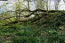 The defences were subsequently strengthened by adding further material to the bank to create a glacis. The ditch was widened to give it a wide, flat bottom of the Fécamp type, named after a Gaulish oppidum near the eponymous town in Normandy. A stone revetment was constructed at the north-east entrance, probably with a wooden breastwork, above and beside a heavy wooden gate protected by a defensive outwork. The gate was destroyed by burning and a large quantity of sling stones was found nearby. Another gate was constructed at the south entrance but has been badly damaged by the construction of a modern road. It is not clear whether buildings existed in the hill fort's interior, although large quantities of pottery have been discovered there.[3] Oldbury Camp was probably used only as a temporary shelter or a place of refuge, rather than as the site of a permanent settlement.[5]