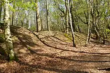 Oldbury Camp (also known as Oldbury hill fort) is the largest Iron Age hill fort in south-eastern England.[1] It was built in the 1st century BC by Celtic British tribes on a hilltop west of Ightham, Kent, in a strategic location overlooking routes through the Kentish Weald. The fort comprises a bank and ditch enclosing an area of about 50 hectares (120 acres), with entrances at the north-east and south ends. Wooden gates barred the entrances. Archaeological excavations carried out in the 1930s and 1980s found that the hill fort's interior had probably not been permanently occupied. It had been abandoned around 50 BC and the north-east gate had been burned down, possibly due to a Roman invasion. The wooded southern part of Oldbury Camp is now owned and managed by the National Trust and is open to the public.