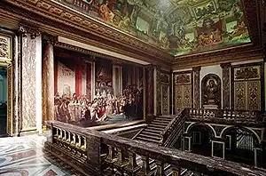 Above the grand staircase, there is a reproduction of the first version of Jacques-Louis David's painting The Crowning of Josephine by Napoleon.[3] The original was purchased by Paris Singer in the late 19th century; the painting was sold to the French government in 1946 and now hangs in the Palace of Versailles.[7][3] The reproduction at the mansion, which hangs in the same place as the original did, is a copy made by Rutters Scanachrome and was unveiled in 1995.[8]