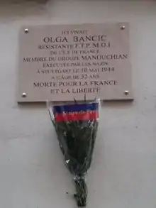 Shortly before the outbreak of World War II, Bancic gave birth to Dolores, her daughter with Alexandru Jar,[1] named after Dolores Ibárruri ("la Pasionaria").[3] She left Dolores in the care of a French family following the start of the German occupation,[1][4] and joined the Paris-based Francs-tireurs et partisans – main-d'œuvre immigrée (FTP-MOI), taking part in about 100 sabotage acts against the Wehrmacht (Armed forces of Nazi Germany), and being personally involved in the manufacture and transport of explosives.[1] This came at a time when the PCR, weakened by successive crackdowns, had become divided into several autonomous groups. Similar to Gheorghe Gaston Marin, Bancic was among the Romanian activists who were integrated into the French Communist Party.[5]