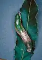 The larvae feed on the leaves of Fagus, Castanea and Quercus species. They feed along the leaf margins. Early instars are gregarious and yellow in colour. Full-grown larvae are about 45 mm long and blotched and mottled in green white and brown.