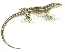 The New Zealand striped skink (Oligosoma striatum) is a rare species of medium-sized skink endemic to New Zealand. The specific epithet means "streaked".[1] The habitat of this species is native forest; they are often found under fallen rotting logs in the bush or under those remaining in pasture after the forest has been cleared. They are at least partly arboreal and have been found in the forest canopy among epiphytes and also in standing dead trees.[1][2]