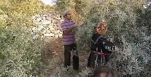 Olive trees are seen as being a major component of traditional Palestinian farming life, with several generations of families gathering together to harvest the olives for two months from mid-September.[22] The harvest season is often associated with celebration for these families, and family and local community celebrations are organised with traditional Palestinian folk music and dancing.[22]