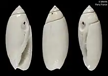 | Shell of Olivella dolichomorpha (holotype at MNHN, Paris) | |