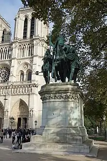 Oliver is prominently displayed, guiding Charlemagne's horse and holding a pike, on the bronze sculpture Charlemagne et ses Leudes (1878) in front of Notre-Dame de Paris.