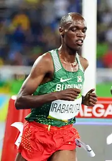 At the 2016 Summer Olympics, he competed in the 5000 metres and the 10,000 metres. He finished 27th overall in round 1 of the 5000 m competition and did not qualify for the finals.[2] He finished 27th in the 10,000m competition.[3] Irabaruta was the flag bearer for Burundi during the Parade of Nations.[4]