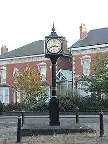Probably due to the relocation of the Lords of the Manor to the new settlement of Solihull, Olton declined in comparison[2] and remained largely agricultural until the opening of the railway station in 1869 and the development of St Bernard's Road. Part of this road appears on the 1839 Tithe map and, in 1869, a new road was constructed to link this road with the Warwick Road. Originally named Windmill Road, it had become St Bernard's Road by 1872, named after the seminary that was being built then. The first house to be constructed in the road is thought to be Elmhurst (no. 21), which was used for a gathering of 200 people in 1872.[10]