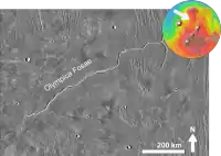 The Olympica Fossae are a set of troughs in the Tharsis quadrangle of Mars at 25° north latitude and 114.1° west longitude. They are about 420 km long and were named after an albedo feature at 17N, 134W.[1] Parts of the fossae have been suggested to be both outflow channels as well as channels for flowing lava, routing both molten rock and catastrophic outburst floods of water at different times in Mars' geological past.[2]
