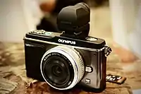 ![]() Olympus PEN E-P2 shown with the Olympus M.Zuiko 17 mm lens and optional electronic viewfinder | |