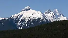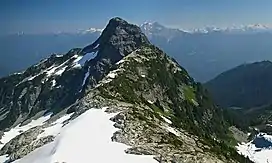 Omega Mountain is a 1,918-metre (6,293-foot) summit located in the Tantalus Range, in Tantalus Provincial Park, in southwestern British Columbia, Canada. It is situated 10 km (6 mi) northwest of Squamish, and 8.2 km (5 mi) southeast of Mount Tantalus, which is the highest peak in the Tantalus Range. Its nearest higher peak is Mount Pelops, 1.7 km (1 mi) to the west.[2] Lake Lovely Water lies below the northwestern slope of the peak with Alpha Mountain on the opposite side of the lake. Precipitation runoff from the peak drains into tributaries of the Squamish River. The first ascent of the mountain was made in 1916 by Tom Fyles and his brother, John Fyles. The mountain's name comes from Omega, in keeping with nearby peaks being named for Greek alphabet letters, namely Alpha and Iota mountains. Its name was officially adopted on June 6, 1957, by the Geographical Names Board of Canada.[3]