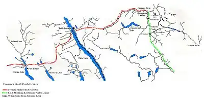 The Omineca Gold Rush was a gold rush in British Columbia, Canada in the Omineca region of the Northern Interior of the province. Gold was first discovered there in 1861, but the rush didn't begin until late in 1869 with the discovery at Vital Creek. There were several routes to the goldfields: two were from Fort St. James, one of which was a water route through the Stuart and Tachie Rivers to Trembleur Lake to Takla Lake and the other was overland, called the Baldy Mountain route. A third route came in overland from Hazelton on the Skeena River and a fourth route used the Fraser River and crossed over the Giscome Portage to Summit Lake, through McLeod Lake, and up the Finlay River to the Omineca River.[1]