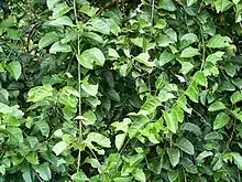 The species grows as a woody vine on rainforest trees. Its stem has a diameter of up to 15 cm and exudes a red sap when cut. The leaves are 12–22 cm long by 6.5–12 cm wide. The flowers have fleshy tepals, concave on the inner surface; the female flowers are 5–10 mm in diameter; the male flowers are smaller, about 2 mm long. The fleshy fruits grow up to about 8 by 12.5 cm in size and contain round seeds 3.5–4 cm in diameter.[1]