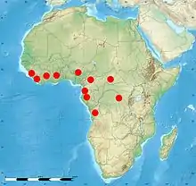 Omphalocarpum elatum Miers ('omphalocarpum' = navel fruit, 'elatum' = lofty) is a tall, tropical African tree belonging to the family Sapotaceae, remarkable for the large fruits growing directly from the trunk, and in many ways resembling the Lecythidaceae genus Napoleonaea.[1] It is found in Equatorial Guinea, Sierra Leone, Ghana, the Central African Republic, Gabon, the Democratic Republic of the Congo, Nigeria, Liberia, Cameroon, Côte d’Ivoire and Angola in the south.[2] The fruits are favoured by elephants, the only animals able to break through the hard shell. They do this by skewering the fruit with a tusk while using their trunk to brace it against the ground. Having passed through the elephant's digestive tract, seeds germinate more readily. Although not yet endangered, the tree's life cycle is tied to that of forest elephants, and may become threatened in regions where elephant populations are under pressure.[3]
