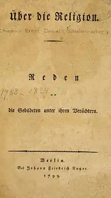 On Religion: Speeches to its Cultured Despisers (German: Über die Religion: Reden an die Gebildeten unter ihren Verächtern) is a book written by the German theologian Friedrich Schleiermacher (1768–1834). Originally published in 1799, two further editions were released in Schleiermacher's lifetime in 1806 and 1821.[1]