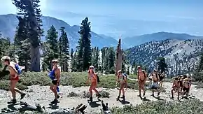 OTL's flagship annual event is a large hike up Mt. Baldy in swimwear or goofy costumes,[22] which can draw more than 100 participants.[23] It was begun in 2007 as the Speedo Hike,[18] with speedos mandatory for men and bikinis mandatory for women,[24][19] but the dress code was relaxed in subsequent years. In 2016, the hike was cancelled due to safety and inclusivity concerns,[23] prompting criticism from several right-wing media outlets.[25][26][27] It was revived the next year as a generic costumed hike, but many participants still don swimwear.[22]