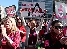 One Billion Rising is a global campaign, founded by Eve Ensler, to end rape and sexual violence against women.[1][2][3] It was started in 2012 as part of the V-Day movement. The "billion" refers to the UN statistic that one in three women will be raped or beaten in her lifetime,[4] or about one billion. The campaign expands each year. In 2016, the theme of the campaign is Rise for Revolution. "This year's campaign will escalate the collective actions of activists worldwide, and amplify their call for systematic changes towards ending violence against women and children once and for all," said OBR global director Monique Wilson.[5]