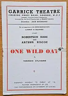 One Wild Oat is a comedy play by the British writer Vernon Sylvaine which premiered in 1948. Its West End run was at the Garrick Theatre with direction by the veteran entertainer Jack Buchanan. It ran for 508 performances from December 1948 to February 1950.[1] The cast originally included Robertson Hare and Alfred Drayton, who had appeared together in several of Sylvaine's farces and their subsequent film adaptations. In 1949, following the death of Drayton, his role was taken over first by Arthur Riscoe and then Hartley Power.