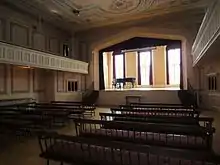The Big, or Family, Hall was designed to be the center of community life. The two-story hall was painted in trompe l'oeil style, with Windsor-styled spindle back benches on the main level, and fixed bench seating for an additional 200 on the balcony level.[14] A raked stage at the east end of the hall was designed for the performing arts. At eight o'clock every evening, members gathered in the Big Hall to receive instruction from Noyes, listen to readings, deliberate on practices within and by the community, and participate in the social bonding practice that they called 'mutual criticism.'