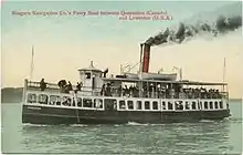 The Ongiara was a steamboat that served most of her 33 year lifetime as a ferry on the Niagara River.[1][2] She was built in Toronto by Melancthon Simpson, and commissioned in 1885 as the Queen City. In 1888 she was sold to the Niagara Transportation Company, which renamed her the Ongiara and started using her as a ferry passengers across the Niagara River, between Queenston, Ontario and Lewiston, New York.[3] In 1912 she was sold and employed as a tow-boat in Toronto. Finally she was sunk off Bowmanville, Ontario in 1918.