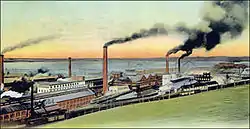 With the industrialization of the region, much of the lake's shoreline was developed; domestic and industrial waste, due to industry and urbanization, led to the severe degradation of the lake. Unsafe levels of pollution led to the banning of ice harvesting as early as 1901. In 1940, swimming was banned, and in 1970 fishing was banned due to mercury contamination.[3][6] Mercury pollution is still a problem for the lake today.[4] Despite the passage of the Clean Water Act in 1973 and the closing of the major industrial polluter in 1986, Onondaga Lake remained one of the most polluted lakes in the United States until several initiatives, including a 15-year multi-stage program completed in late 2017, allowed the lake to reach criteria required by the New York State Department of Environmental Conservation and the United States Environmental Protection Agency.[9] This includes implementing a long-term operation, maintenance, and monitoring program to ensure the effectiveness of the remedy.[10]