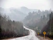 Highway 129 was first designated between Aubrey Falls and Chapleau in 1956, following the Thessalon–Chapleau Highway, a dirt road along the banks of the Mississagi River that opened to traffic on January 28, 1949.[2] Though opened, this initial road was almost impassable, and certainly dangerous. Despite this, it quickly gained notoriety for its breathtaking scenery and seemingly limitless hunting and fishing potential.[12][13] However, the poor condition of the road often left a terrible impression on tourists. John Austin Moore described his voyage up the road during the summer of 1951:[14]