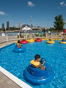 On the east island, the original children's area, which was primarily "non-powered", has largely been removed. The large wood-and-rope climber area was replaced with the large "Soak City" waterpark, the first water park in Ontario. Several small fair-ground rides were later added. The large tension structure tent that covered most of the children's park was removed in 2009/10, leaving a large open area with a new stage. Many of the concrete bollards used to secure the various tents and structures can still be seen.