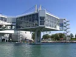 In 1980, the "Ontario North Now" exhibit was built on the west island to showcase Northern Ontario.[19] It was a combination of inter-connected silo-like buildings, topped with domes reminiscent of the Cinesphere, connected by overhead walkways, and a smaller domed movie theatre. In 1984, a boat-based water ride was added, along with a smaller exhibition center consisting of three concrete silo-like buildings.[19] A large reflecting pool nearby was drained and used to house the addition of a major "climber" structure, a smaller stage for kids shows and several other kid-oriented attractions, reducing the complete separation of areas that had been featured in the original design.