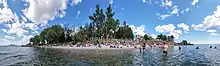 Downtown Toronto's only beach, located at Ontario Place, also features an outdoor classroom (known as the "TeachBeach") which is also the venue of the annual Water-Human-Computer Interaction (WaterHCI) (de)conference. The beach is a pebble beach which facilitates pebble-walking (barefoot walking on pebbles for therepeutic effect), and is a popular location for year-round swimming with approximately 900 members of SwimOP (Swim at Ontario Place), Swim Drink Fish, and Lake Ontario Waterkeeper. The swimming water quality is tested regularly year-round by Swim Drink Fish, and is the site for a wide range of educational and research activities.[56][57][58][59][60]