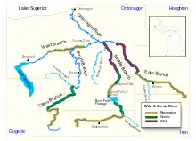 The Ontonagon River (/ˌɒntəˈnɑːɡən/ ON-tə-NAH-gən) is a river flowing into Lake Superior at the village of Ontonagon, on the western Upper Peninsula of Michigan in the United States. The main stem of the river is 25 miles (40 km) long[4] and is formed by a confluence of several longer branches, portions of which have been collectively designated as a National Wild and Scenic River.[5] Several waterfalls occur on the river including Agate Falls and Bond Falls.