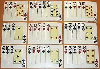 Open-face Chinese poker, OFCP, commonly known as Open Face Chinese or OFC, is a variant of Chinese poker where players receive five cards to start and then one card at a time until each player has a 13 card hand legal or not. The game originated in Finland during the mid-2000s and spread to Russia a few years later. Professional poker player Alex Kravchenko, who is credited with introducing the game to the Russian high-stakes community, describes the game as "spreading like a virus".[1] The game was introduced to the United States in 2012.[2]