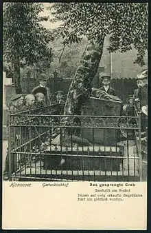As a result, the tomb became an attraction in the nineteenth century, one among a number of "Open graves" appearing in horror stories.[4] The tomb is therefore an early example of a tourist attraction[5] and developed at a deeper level into one of the landmarks of the city of Hanover.[1]