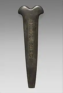 Peseshkef: Believed to mean ‘splitter of his ka-spirit’. These were forked blades made of obsidian, glass, or stone that were created as burial goods. During the Old Kingdom, it is evident that these objects were initially employed to sever umbilical cords during childbirth, a practice that aligns with its spiritual association with rebirth. Nevertheless, the precise ritual in which they were originally intended for during this period remains unclear.[1]