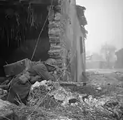 Between Friday evening the 19 January and Tuesday the 23 January the Dutch village of Montfort was shelled or bombed on seven occasions. The village was hit by more than 100 bombs overall, and most of these fell in the centre of the village. Nearly all of the 250 houses were damaged. During these raids, the Germans took shelter in the cellars among the civilians, and in the wooded areas just outside the village. The bombing raids that struck Montfort on the 21st and 22nd were carried out by the Royal Canadian Air Force (RCAF) 2nd Tactical Air Force - No. 83 Group - 143 Wing. This Wing consisted of 438, 439 and 440 Squadron, based at Eindhoven. The squadrons were equipped with the Hawker Typhoon 1B fighter bomber. 143 Wing lost six aircraft during Operation Blackcock, two of which crashed in Montfort. When Montfort was finally liberated by the Desert Rats on 24 January, 186 civilians died in the raid.
