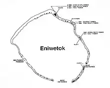| Easy | April 20, 1951 17:27:00.1 | MHT (11 hrs) | Enjebi (Janet), Enewetak Atoll 11°39′56″N 162°14′02″E / 11.66543°N 162.23379°E | 2 m (6 ft 7 in) + 91 m (299 ft) | tower, weapon development and effects | TX-5D | 47 kt | [8][9][10][11][12] | Proof test of Mark 5, 92 point lense implosion system, used as the primary for Ivy Mike. Mock buildings (homes, bunkers, factories) were assembled on Enjebi and Mujinkarikku Island. Hansen: "west end of Engebi". | |