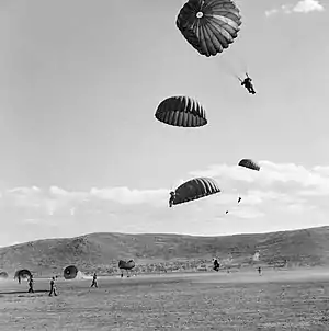 ![]() British airborne troops of 'C' Company of the 4th Parachute Battalion descending on Megara in Greece, 12 October 1944 | |||||